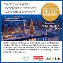 It's called The Science & SciLifeLab Prize for Young Scientists and it has been created to recognise excellence in PhD research. The grand prize winner of this major global award, aimed at young life scientists, will have their paper published in the journal Science and receive $25,000 in prize money. Three runners up will receive a combined total of an additional $10,000. The prizes will be presented to the winners in Stockholm, Sweden in the middle of December 2013.