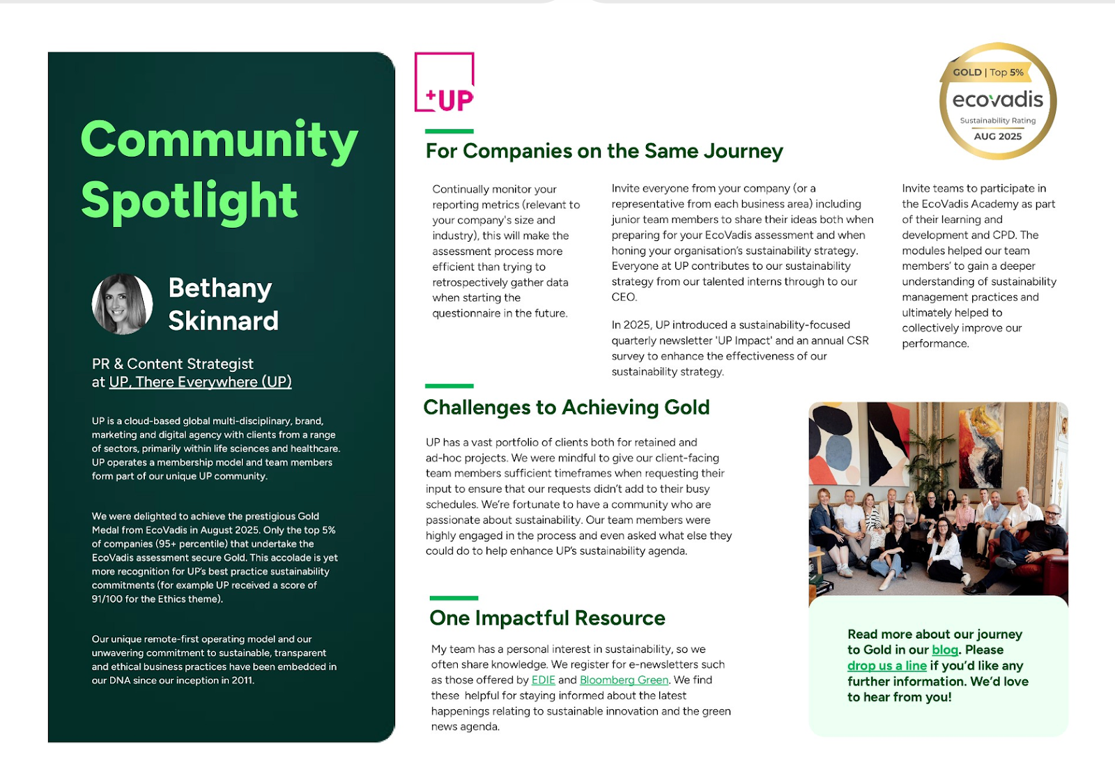 From the outset, we realised JUST how effective the EcoVadis Community could be in helping to enact best practice. We were delighted to be offered the chance to share details about our journey to Gold in our ‘EcoVadis x Bethany’ case study. As the UP team works with clients in a variety of sectors, the opportunities for upskilling with peers on a global basis has proved to be highly beneficial.