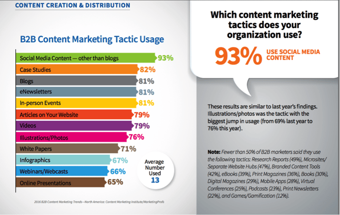 Social media is a very effective tool for many B2B companies not only for promoting their content (more on this here) but also for keeping tabs on the pulse of their markets — what's known as social listening. In fact, according to a 2016 report from Content Marketing Institute, 93% of B2B marketing organizations use social media. However, according to the same report, only 35% have documented their social media strategy. This could be a major downfall to success (read on for tips below).